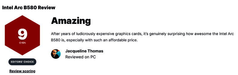 IGN为英特尔Arc B580显卡打出了9分的评分,认为这款显卡有极高的性价比,在同价位上显现出优势,是一款值得入手的显卡。