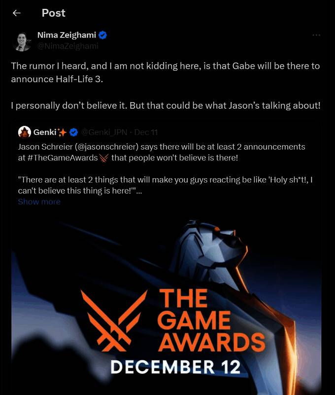 他表示他是从游戏行业一名从业人士那里听到的消息。他称Gabe本人将会亲临TGA公布这一消息,但由于消息源并不是直接在V社工作,所以他本人也不是那么相信