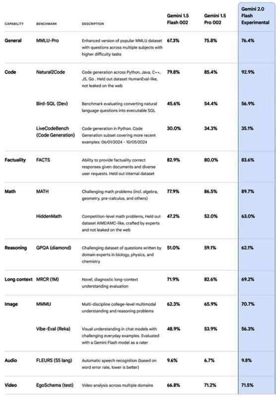 Gemini2.0关键基准测试中相较于前代产品Gemini 1.5 Pro实现了性能的大幅提升,速度甚至达到了后者的两倍。