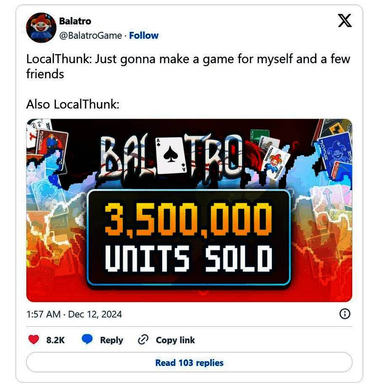 开发商LocalThunk在推特上宣布,《小丑牌》目前在全球所有平台上的销量已超过350万份。8月份,该游戏的销量为200万份,显然,这款游戏目前依然保持着相当出色的销售势头。近几个月来,该游戏不仅推出了新的合作DLC和移动版,也获得了多项TGA提名,甚至包括年度最佳游戏奖,所有这些都将促进该游戏继续保持强劲的销售势头。