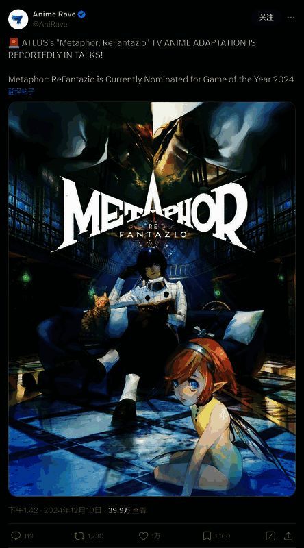 根据“推特上最大的动漫新闻页面”AniRave报道,基于《暗喻幻想:ReFantazio》的 TV 动画改编系列目前正在洽谈中。