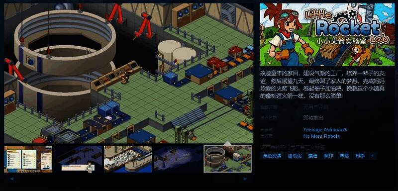 今日(12月11日),自动化建造角色扮演游戏《小小火箭实验室》Steam页面开放,发行日期待定,游戏支持简体中文,感兴趣的玩家可以点击此处进入商店页面。