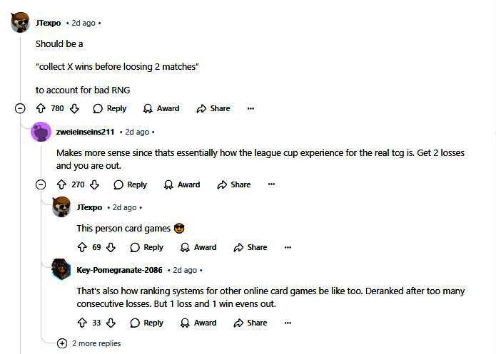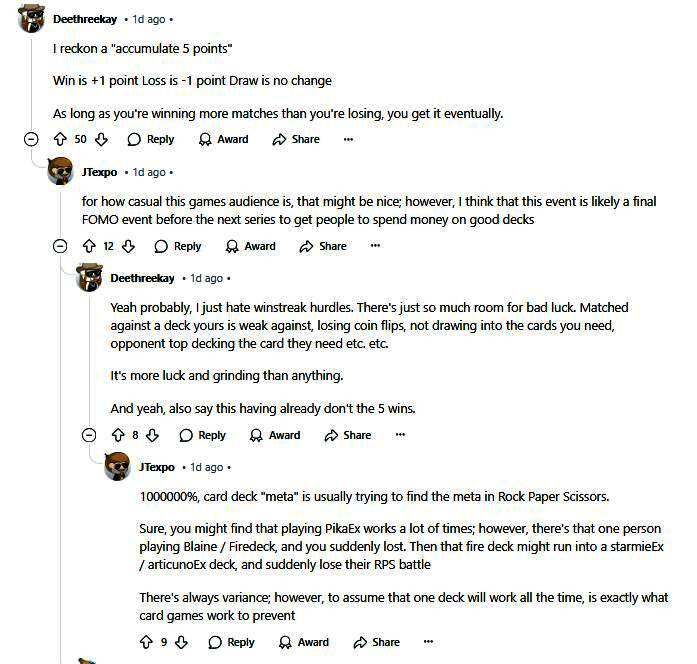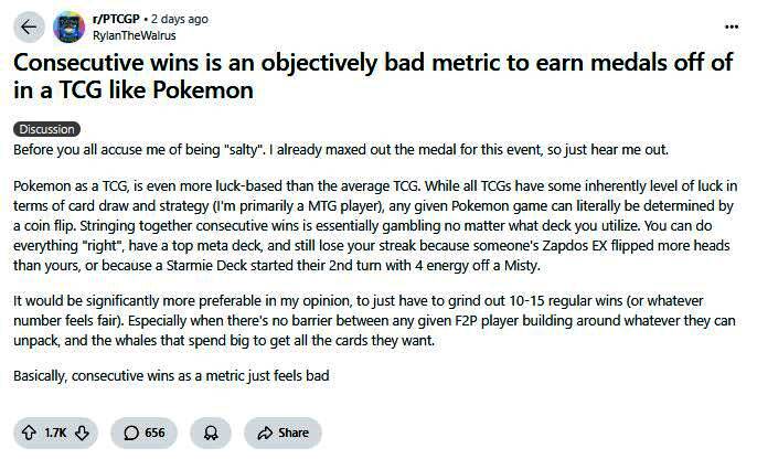 对于一款基本以运气为基础(游戏中存在不少掷硬币发动的技能,而且由于机制问题,后手玩家掌握对战优势,决定先后手同样需要掷硬币)的游戏,无法通过配牌及玩家技术来提高连胜的胜率,因此引发了部分玩家的不满,认为尝试解锁该活动的勋章奖励就是在“浪费时间”。