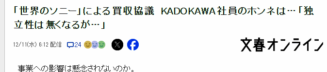 近期最大的业界话题莫过于索尼意向收购角川了,目前外界普遍看好这次“强强合作”,那么角川的员工们真正的心声如何呢?资深曝料日媒《文春在线》日前采访了部分员工,一起来了解下。