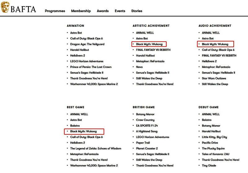 英国电影与电视艺术学院奖(BAFTA)在近日公布了2025年完整的游戏奖项入围名单,其中《黑神话:悟空》获得了最佳游戏奖的提名。