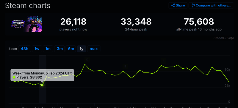 可以看到下图,今年《守望先锋2》Steam平台在线玩家较少的一次出现在2024年2月5日,当时仅2.8万人,而今年12月的数据更少,只有2.6万人。