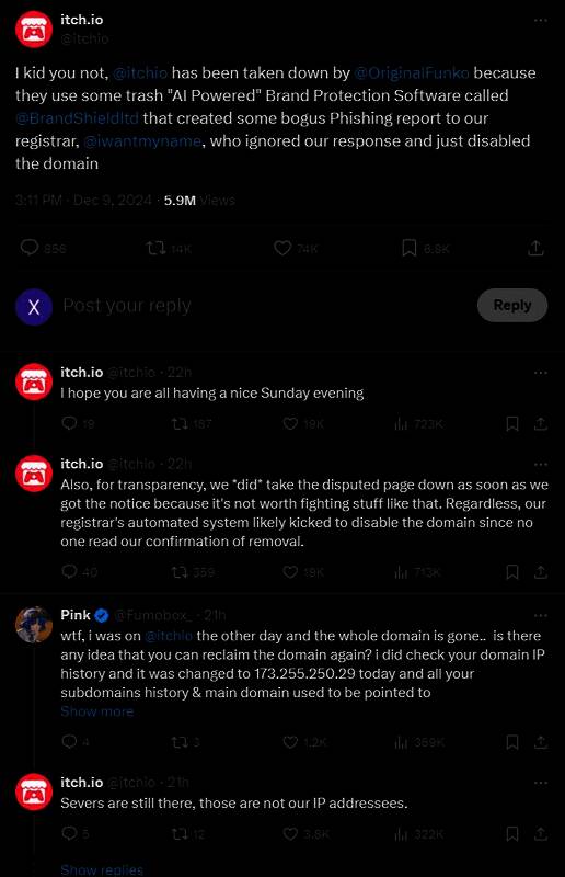 不过itch.io在12月9日突然下线,根据官方的公告声明,“itch.io已经被Funko(美国潮玩公司)的‘Funko Pop’关停”,是因为Funko使用了一些名为“BrandShieldltd”的品牌保护软件。该软件利用AI标记有争议的网页,并向Itch.io的网域注册商iWantMyName发送了一份“假的网路钓鱼报告”,结果iWantMyName忽略了Itch.io的回复并直接禁用了网站的域名。