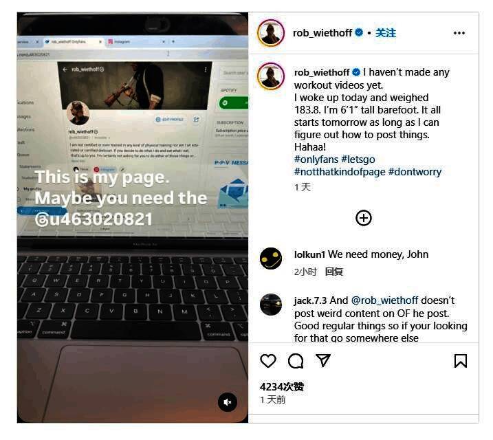 罗布·维特霍夫在INS中说道:“这个账号和其他的OnlyFans账号不一样,如果你关注了,你会看到一个老家伙在锻炼。就是这样。不过我的计划是练出肌肉。如果你愿意,你可以和我一起练。”
