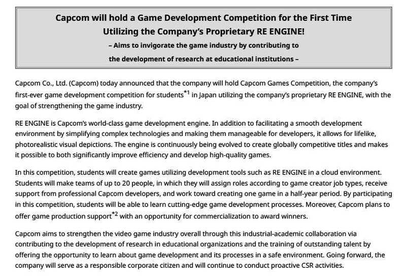 12月9日,卡普空宣布将举行RE引擎游戏制作大赛,这也是卡普空首个利用专有引擎面向日本大学生的游戏制作大赛,本次大赛的目的是为了加强游戏产业。