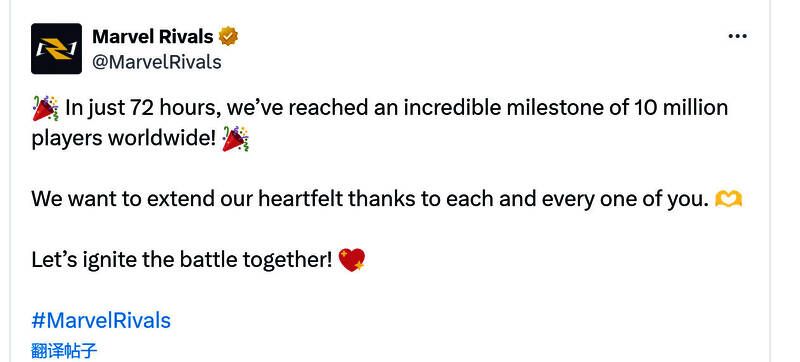 《漫威争锋》官推宣布,仅仅72个小时(3天),该作全球玩家已达到惊人的1000万人,非常感谢支持的每一名玩家。