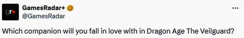 《龙腾世纪4:影障守护者》将于北京时间11月1日0点上线。近日外媒GamesRadar发布视频,展示了游戏中可攻略的角色。GamesRadar还询问玩家:“在《龙腾世纪4》中,你会爱上哪一位同伴?”