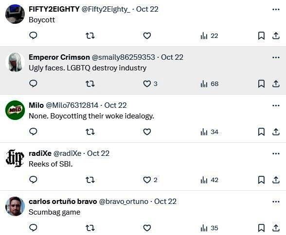 然而在评论区中,玩家们狂吐槽这些角色太丑。有人表示:“我的钱牢牢留在我的钱包里”“一个也没有,抵制这游戏!”“DEI杀死了Bioware”“SBI的恶臭味”“丑陋的面孔,LGBTQ摧毁了游戏行业!”