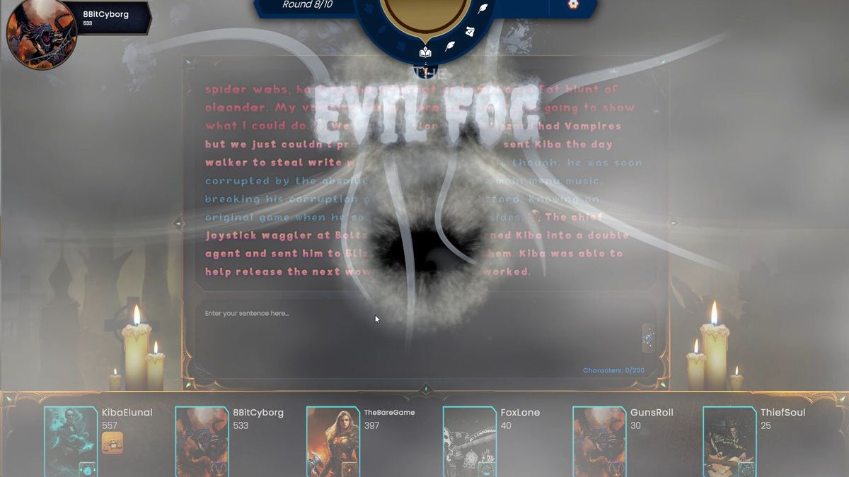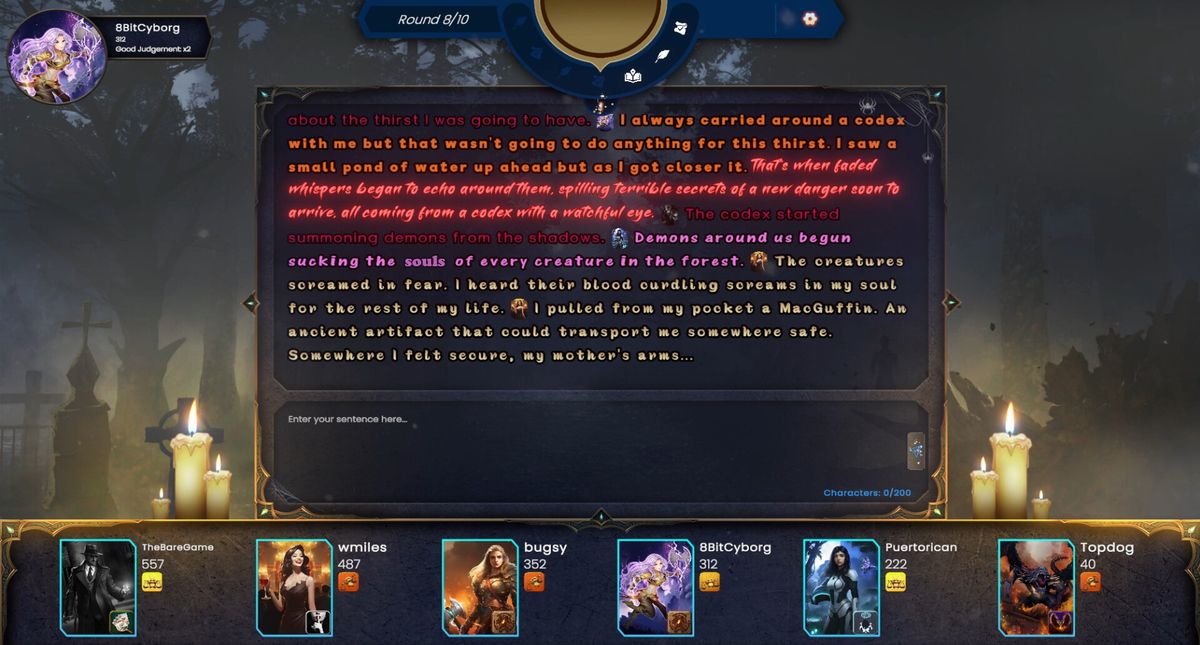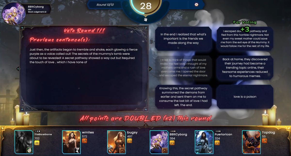 每轮游戏都从写作阶段开始。开头的句子设定了场景,你的任务是写下一个句子。你只有有限的时间来发挥你的创造力,为故事的展开增添新意。