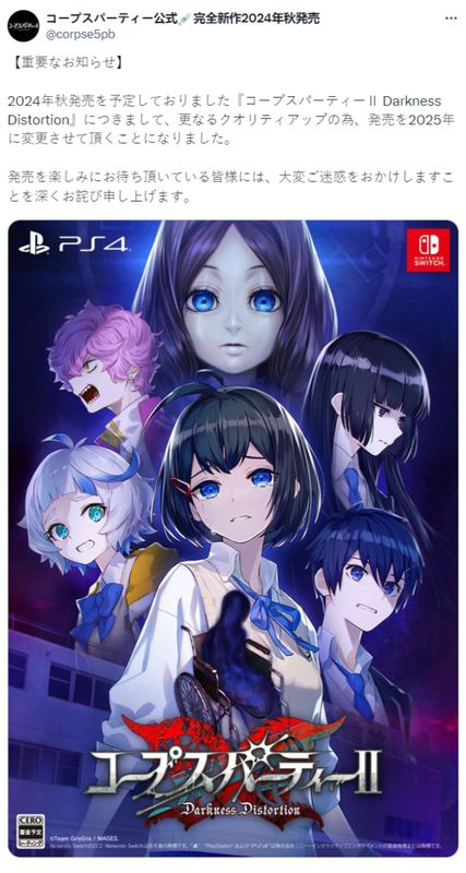 10月16日,开发商MAGES.宣布《尸体派对2:黑暗扭曲》将延期至2025年发售,该作原定于2024年秋季推出,登陆Switch和PS4,官方给出的延期理由是为了进一步提高游戏质量。