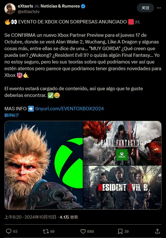 他写道:“新的 Xbox 合作伙伴预览已经确认,其中将包括《心灵杀手2》、《明末(渊虚之羽)》、《如龙》和其他一些内容,其中据说有一个……‘非常大’。”他推测这可能是《黑神话:悟空》或《最终幻想16》登陆 Xbox 的消息,或者也可能是《生化危机9》在发布会上宣布。