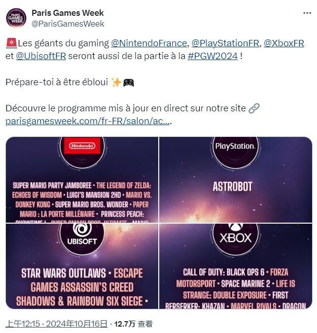 10月16日,巴黎游戏周(简称PGW)宣布“主机御三家”和育碧都将参与今年的展览活动,这是一场每年一度在法国巴黎巴黎凡尔赛门展览馆举行的电子游戏贸易展览会,今年将在10月23日至10月27日期间举办。