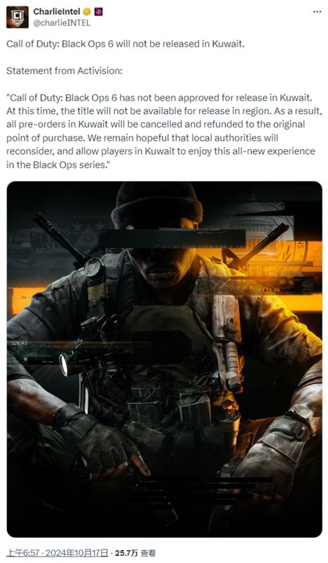 动视发言人在声明中说道:“《使命召唤:黑色行动6》尚未获准在科威特发行。目前,该游戏无法在该地区发行。因此,科威特的所有预购都将被取消,并退款至原付款账户。我们仍然希望当地政府能够重新考虑,并允许科威特的玩家享受《使命召唤:黑色行动》系列的全新体验。”