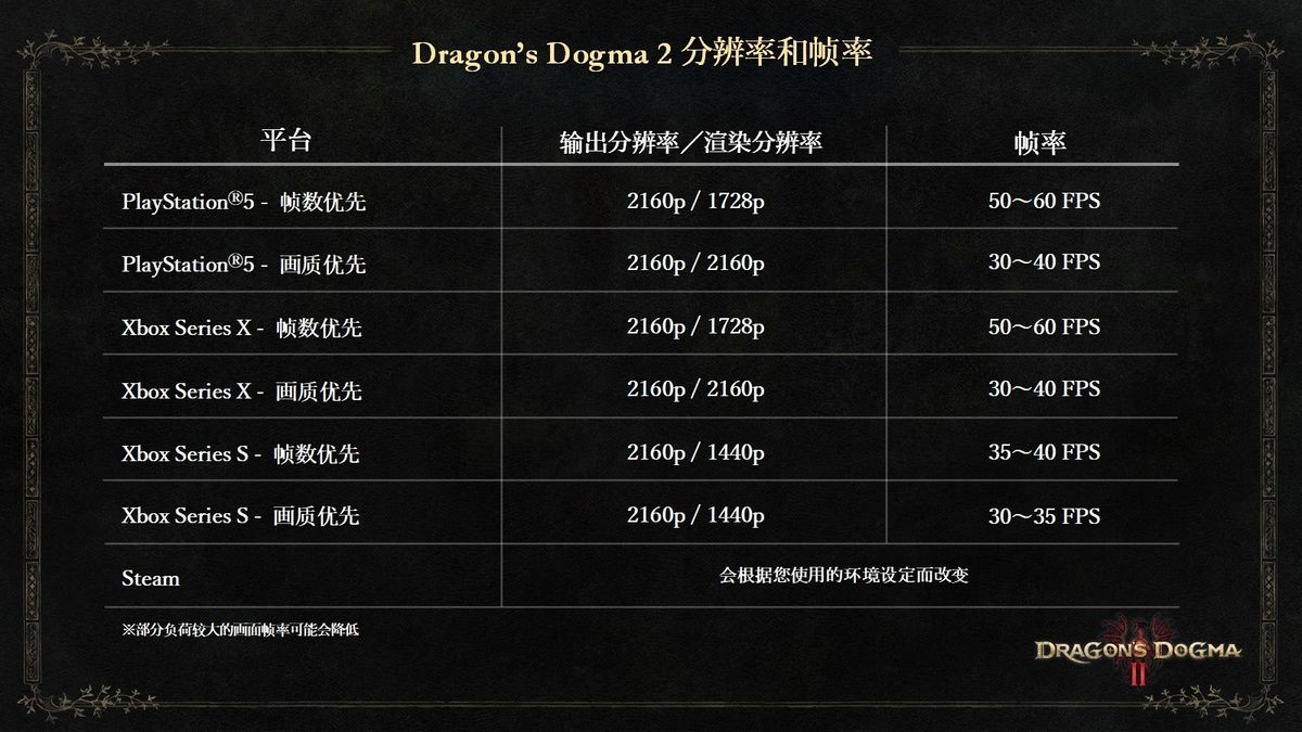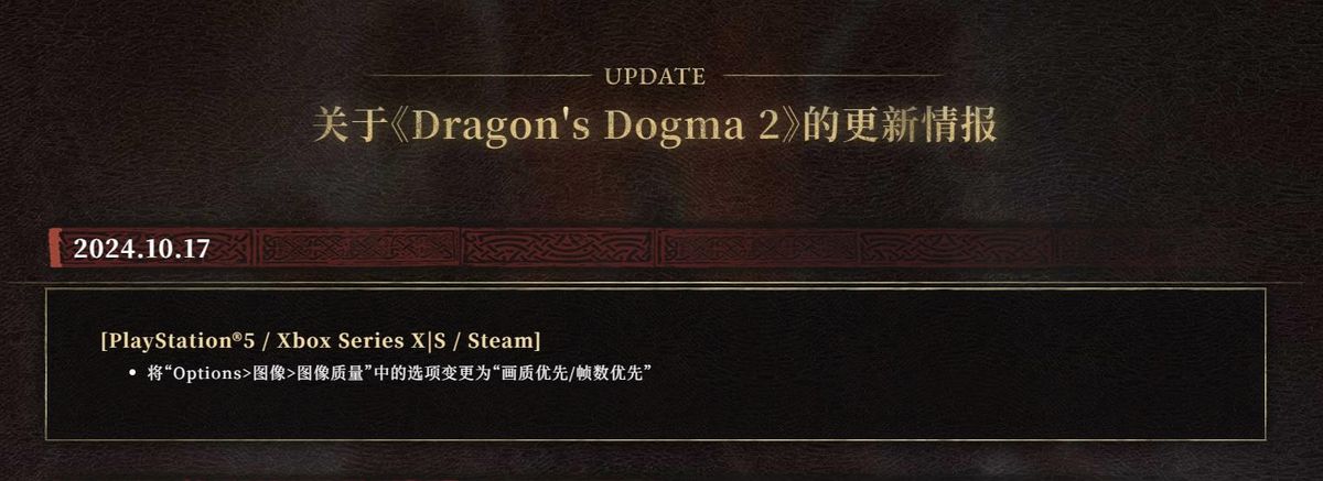 10月17日,卡普空为《龙之信条2》全平台发布了新补丁更新,将“Options>图像>图像质量”中的选项变更为“画质优先/帧数优先”,玩家现在可以选择以“画质优先”或“帧数优先”的设置游玩游戏了,其中卡普空还公布了各平台各设置下的分辨率和帧率情况。