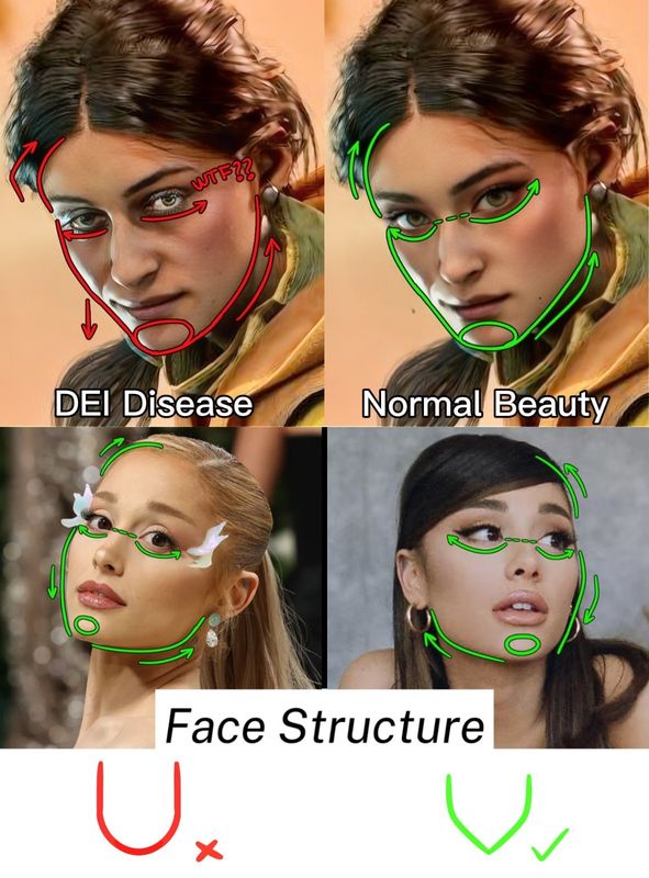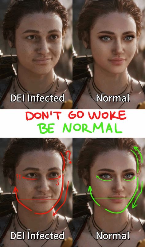 近年来许多欧美游戏里的女性角色变得越来越丑,许多玩家开始指责开发商受LGBT影响,故意丑化女角色。近日,一位阿根廷博主在推特上发图文,展示了这些游戏女角究竟丑在哪儿,要如何才能变得正常。一起来看看他的图吧!