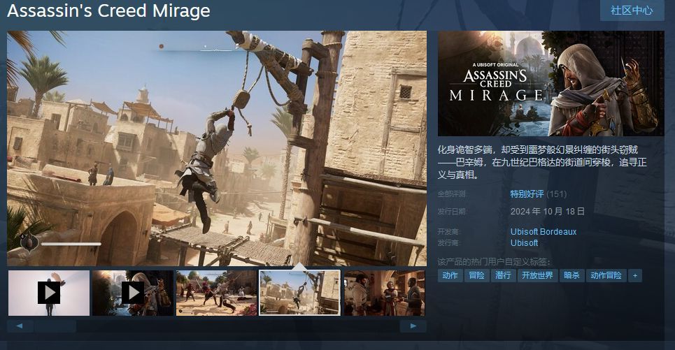 今日(10月18日),育碧《刺客信条:幻景》现已在Steam平台正式发售,该作国区售价248元,发售特惠124元,豪华版149元,刺客大师版224元,截止到发稿前,该作已收获151条玩家评价,好评率为81%,综合评价“特别好评”,感兴趣的玩家可以点击此处进入商店页面。