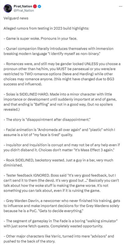 - 无视测试者反馈,QA测试领导说:"这是很好的反馈,但我不能发给他们(开发人员)。这很好,但是......” 基本上,你不能谈论woke是如何让游戏变得更糟的。即使它毁了游戏,你也不能谈论它。