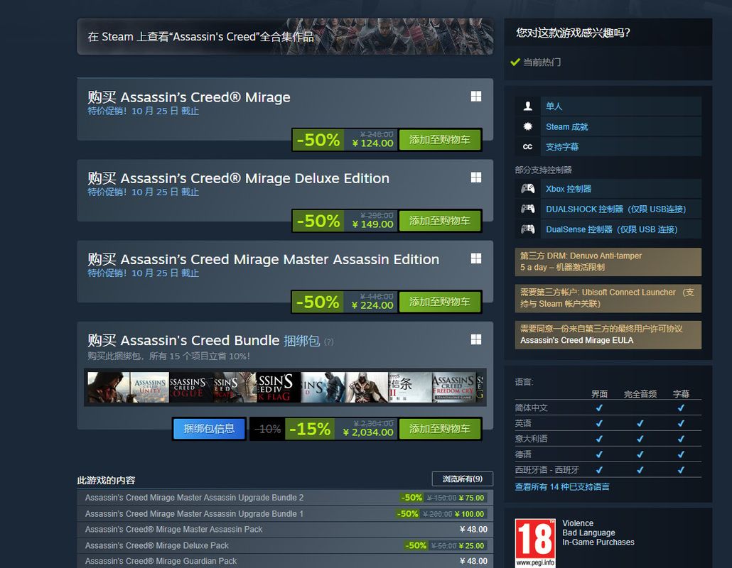 《刺客信条:幻景》现已在Steam正式发售,“首发”半价特惠,原价248元,现价124元,支持简体中文。《刺客信条:幻景》由育碧Bordeaux主导开发,Steam首发“多半好评”。
