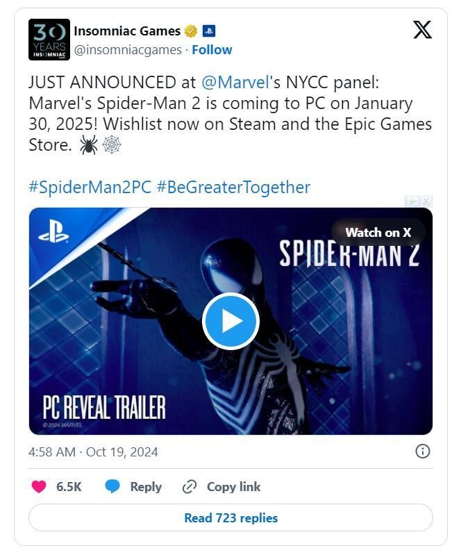 在最近的纽约动漫展上,漫威宣布这款开放世界游戏将于2025年1月30日通过Steam和Epic Games Store在PC平台上推出,由Nixxes Software负责移植。与最近几个月在PC上发行的所有索尼游戏一样,尽管这款游戏是单人游戏,但仍需要一个PlayStation Network账户。