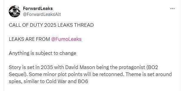 根据推主@FumoLeaks爆料,《使命召唤2025》故事设定在2035年,主角是《黑色行动2》主角David Mason,一些次要情节将被重新设定。仍然是谍战,类似于《使命召唤17:黑色行动冷战》和《使命召唤21:黑色行动6》