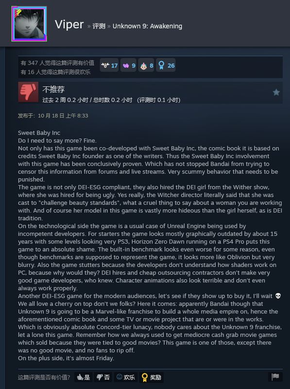 然而不容忽视的是,这款游戏的“正确”要素很有可能也影响了其表现。根据玩家 Viper 指出,这款游戏也与 Sweet Baby Inc. 有着紧密的联系:首先游戏是与 SBI 合作开发的,其次这部游戏改编自的原作漫画的作者之一是 SBI 的创始人。