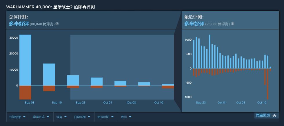 就在发行商 Saber Interactive 宣布《战锤40K:星际战士2》大获成功并为公司带来破纪录的季度收入当天,游戏发布了一个大型更新,添加了全新的内容,但同时也为游戏带来了一系列平衡性改动。正是这些“平衡”让游戏在随后的几天内获得了大量差评——这个景象似乎在另一款杀虫子的游戏里见到过。