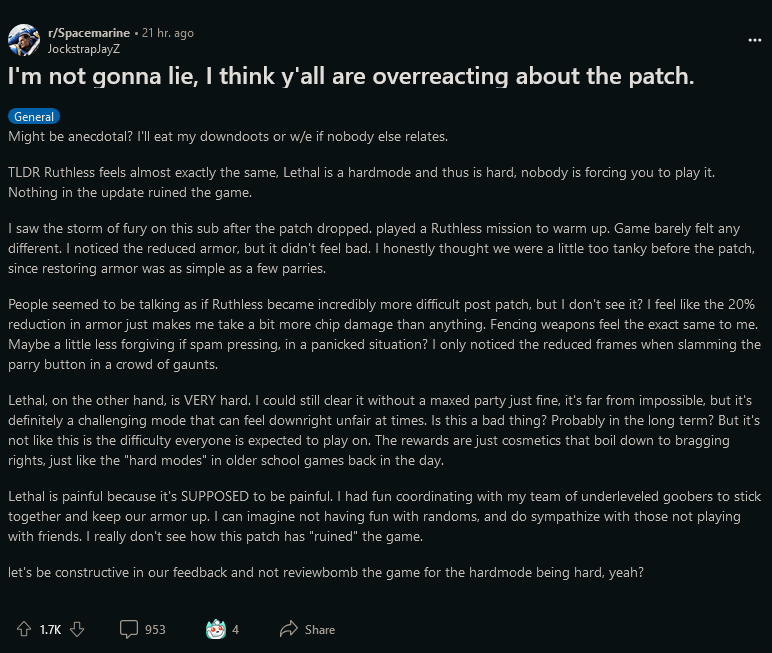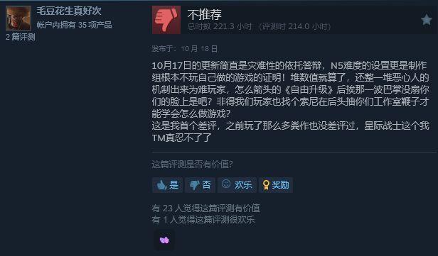 这里提到的前车之鉴就是由 Arrowhead 开发的《绝地潜兵2》。同样是合作 PvE,同样是对抗外星虫子向宇宙散播人类的光辉,《绝地潜兵2》在持续不知悔改的推出多个削弱补丁后,遭到了玩家的狠狠“敲打”,先后多次遭受了“差评轰炸”,终于在最近的两次更新中顺从了玩家一直以来提出的各种补强要求。两款游戏都有着不错的开局,但是在有这种先例的情况下,开发者又要对着 PvE 模式中原本就不平衡的玩家强度砍一刀,而不是让玩家在游戏里获得爽感,这让许多人特别失望,纷纷表示跟谁学不好非得和箭头学。