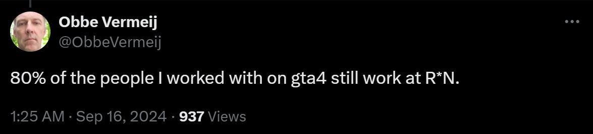 自《GTA5》发售以来,R星在过去的十年内发生了很大的变化,也推出了一些自损名誉的游戏,让部分玩家对《GTA6》产生担忧。不过前R星资深开发者Obbe Vermeij带来了好消息。他说当年参与开发GTA4的团队,80%还在R星(北方)。