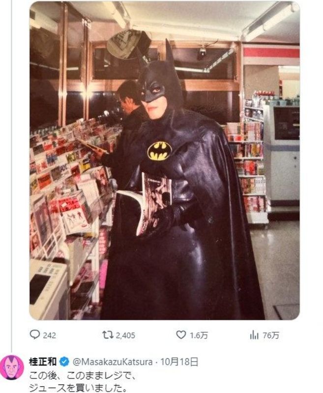 奇装异服逛街购物?这在日本似乎很常见,没想到这位居然是鼎鼎大名的漫画家,日前桂正和晒珍稀旧照,日版蝙蝠侠COS惟妙惟肖,引发网友热议点赞。
