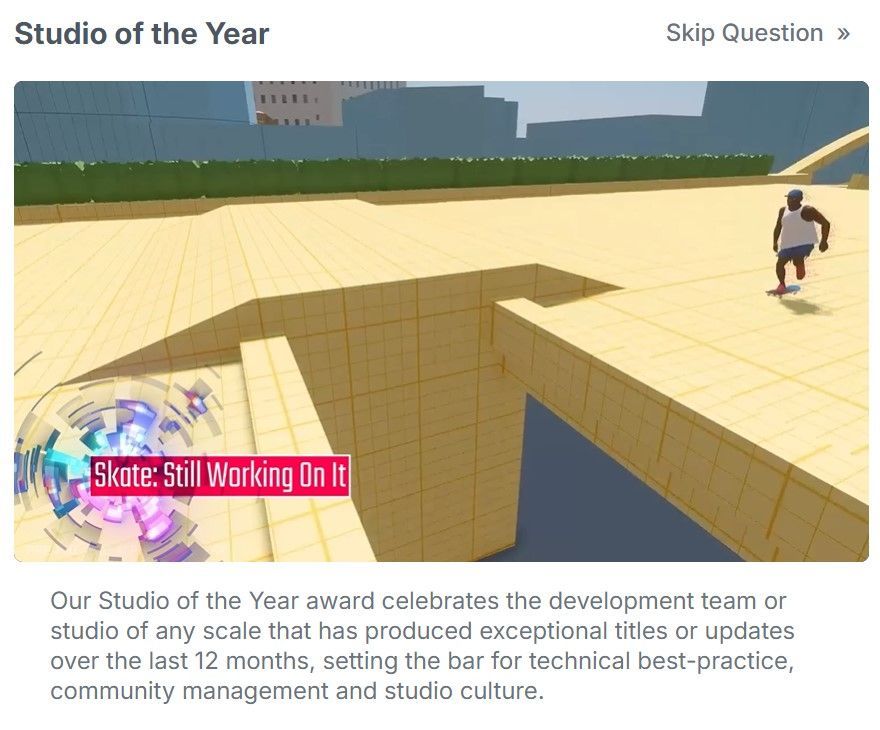 金摇杆奖“年度游戏开发商”的说明是庆祝过去12个月以来任何规模的开发团队/工作室,这些工作室推出了“超绝的游戏/更新”,“为技术最佳案例、社区经营和工作室文化设置了标杆”。