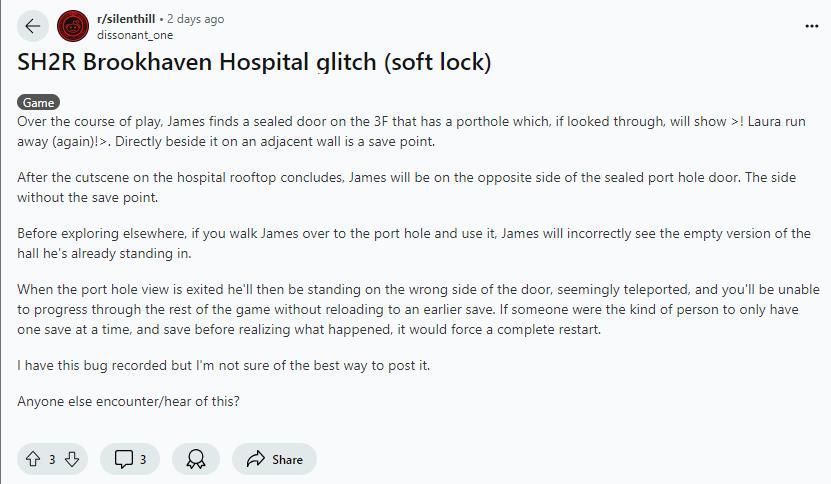 《寂静岭2:重置版》已在本月正式推出,不过有部分玩家在推进到布鲁克海文医院的区域时,遭遇了会让主角詹姆斯卡关的BUG,而现在这些玩家正在警告并告知其他人该如何避免。