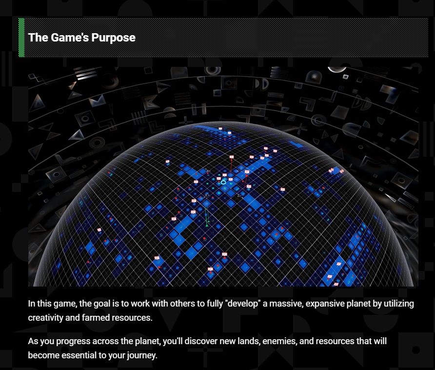 据悉,该游戏需要玩家下载一个2.2GB大小的软件,预计10月23日开始测试。而根据常见问题解答中官方的描述,游戏中玩家将在一个巨大而广阔的星球上共同努力建造和创造,以期望开发整个星球,玩家将发现新的土地、敌人和资源,这些对于玩家的旅程来说至关重要。