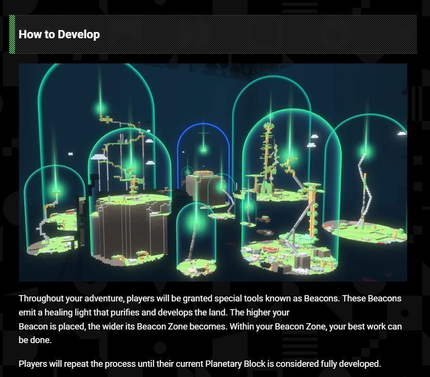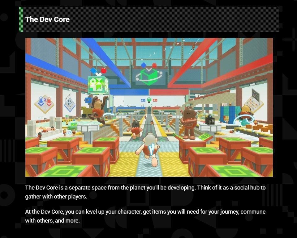 常见问题解答中还描述了一个名为“Dev Core”的地方,据说这是一个单独的社交空间,玩家可以在这里聚集和互动。你还可以使用通过在信标区内建造而获得的开发点数来升级你的角色,而提高你的开发水平将使你获得方便进一步开发活动的物品。
