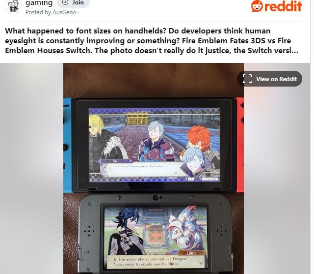 日前游戏论坛Reddit上有玩家吐槽现在游戏字体太小看着费劲,举出经典游戏《火焰纹章》的例子,Switch版比起之前的3DS版明显难看的多,引发玩家热议。