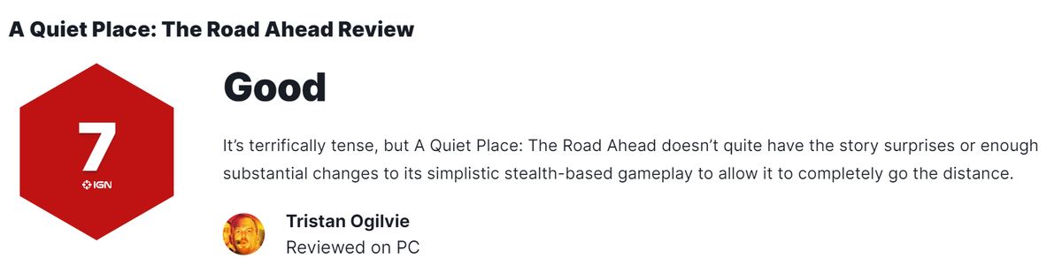 《寂静之地:前方之路》将电影改编称互动性冒险值得陈赞,尽管它保持紧张气氛有时限的太明显了。我非常享受开发人员为游戏打造的恐怖气氛,另外自动保存让我即使死亡也不会感到沮丧。然而,尽管这款游戏每一步都在营造规律性的紧张气氛,但由于没有重大的剧情惊喜,使得我完整的游玩下去。