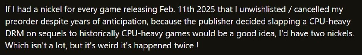 玩家:“如果我有一枚五分硬币(nickel)对应每一款于2025年2月11日发布、而我又取消预购或从愿望清单中移除的游戏,原因是发行商决定在这些历史上有较高CPU需求游戏的续作中加入对CPU占用很高的DRM,那么我将会有两枚五分硬币。虽然不多,但很奇怪这种事已经发生了两次!”
