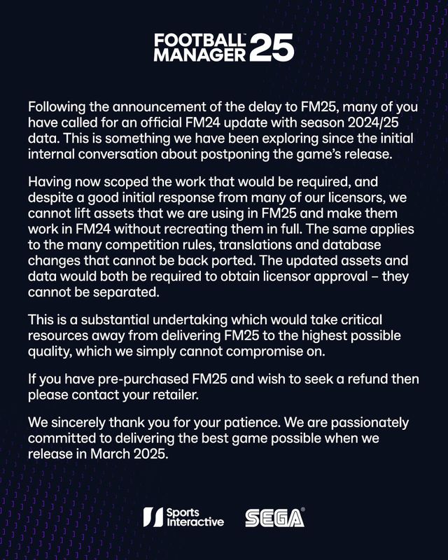 原定于在2024年11月26日发售的体育类策略模拟游戏《足球经理2025》(简称FM 25),在本月确认延期至明年3月发布,对此玩家们呼吁开发商Sports Interactive为《足球经理2024》(简称FM 24)提供新赛季更新内容。