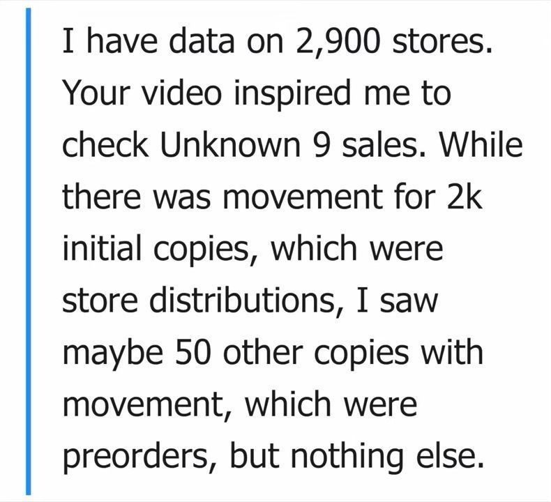 Smash JT 在视频中多次指出,这只是传闻,因为他并没有亲自去确定这位自称员工的身份真实性。但他指出,从游戏的 Steam 表现来看,实体销量惨淡并不令人意外。