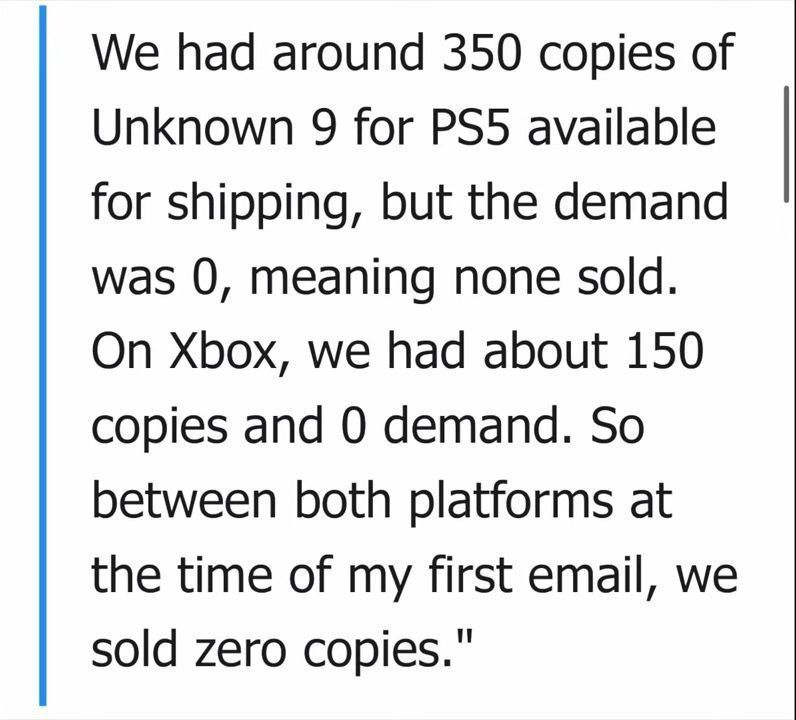 这位员工声称,自己有2900家门店的数据,作为初始门店库存公司有记录2000 份的出库纪录,另外还有 50 份预购的出库量,但此外“没有任何动静”。在公司库存中,有 350 份 PS5 版和 150 份 Xbox 版的《无名九使》随时可以出库,但在这位员工首次联系 Smash JT 到给出确切数据的第二封邮件的4 天期间,2900家门店没有售出任何一份游戏。