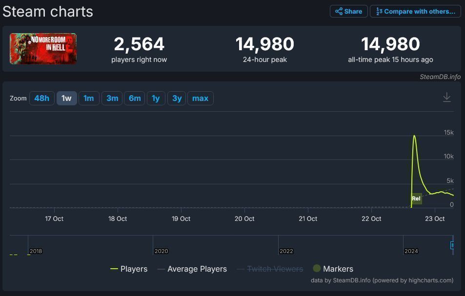 在 SteamDB 上可以看到,《地狱已满2》首发后最多吸引了将近 1.5 万名同时在线玩家,但随后该数字迅速下跌,仅在 5 小时候就跌至2 千至 3 前任左右。目前仍有 2500 名玩家在游玩。