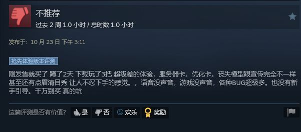这很可能跟游戏存在的问题有关。目前游戏的 Steam 共有 3507 条用户评价,好评率仅为 34.12%。目前玩家的主要批评集中在游戏的优化和服务器问题,此外据称游戏存在许多 BUG,且平衡也有问题。还有外国玩家表示无法理解游戏怎么现阶段被发布的,因为《红霞岛》甚至还能略胜一筹。