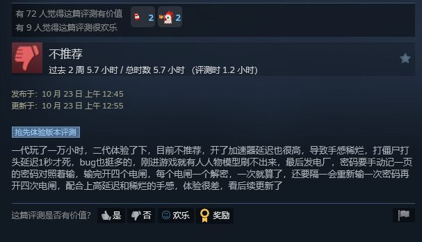 这款续作之所以能吸引这么多玩家,是因为其前作《地狱已满》是许多玩家最喜欢的丧尸游戏。前作于2011 年,Steam 评价为“特别好评”,而且现在完全免费。虽然难度有些高,但它有着自己的特色至今仍有许多粉丝。二代就目前看来并不值得其108 元的“票价”,即便首发就支持简体中文。