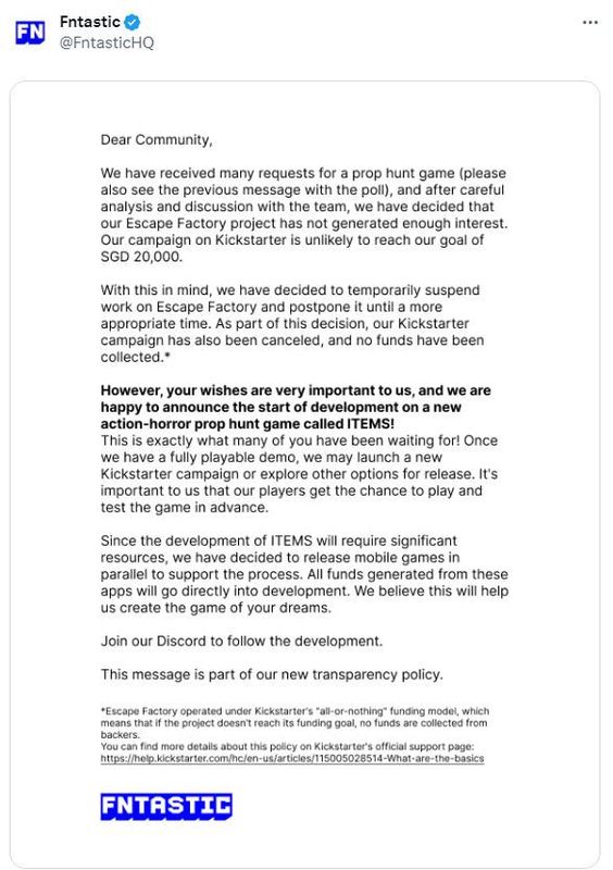与此同时,Fntastic还在公告中宣布了其下一个项目——一款带有恐怖元素的动作游戏《Items》。据工作室员工称,这正是粉丝想要的游戏IP。Fntastic还没有《Items》的演示,但据说正在制作中。试玩版发布后,工作室计划重新开启Kickstarter筹款活动或探索其他方式发布游戏。