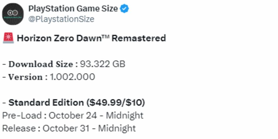 据著名推特主@PlaystationSize消息《地平线:零之曙光重制版》PS5版将于10月24日开启预载,大小为93.322G,本作将于10月31日发售,登陆PS5和PC。