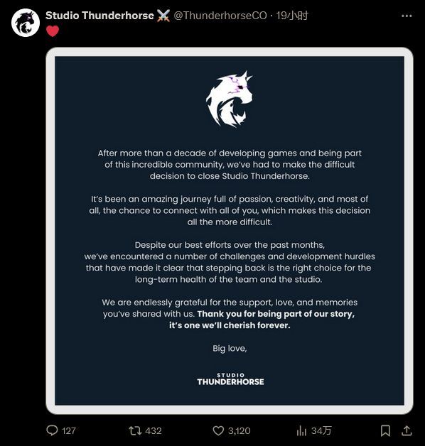 独立开发工作室 Thunderhorse 在成立近十年后宣布即将关闭。这个由3 人组成的小团队在社交媒体上宣布了该消息。
