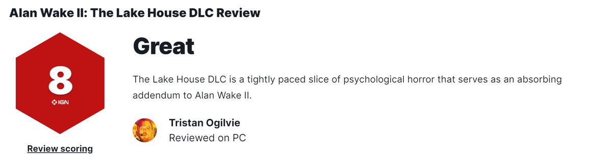 《心灵杀手2:湖边小屋》已经正式发售,外媒IGN为改资料片打出了8分的好评,认为这部资料片是对本体的良好补充。